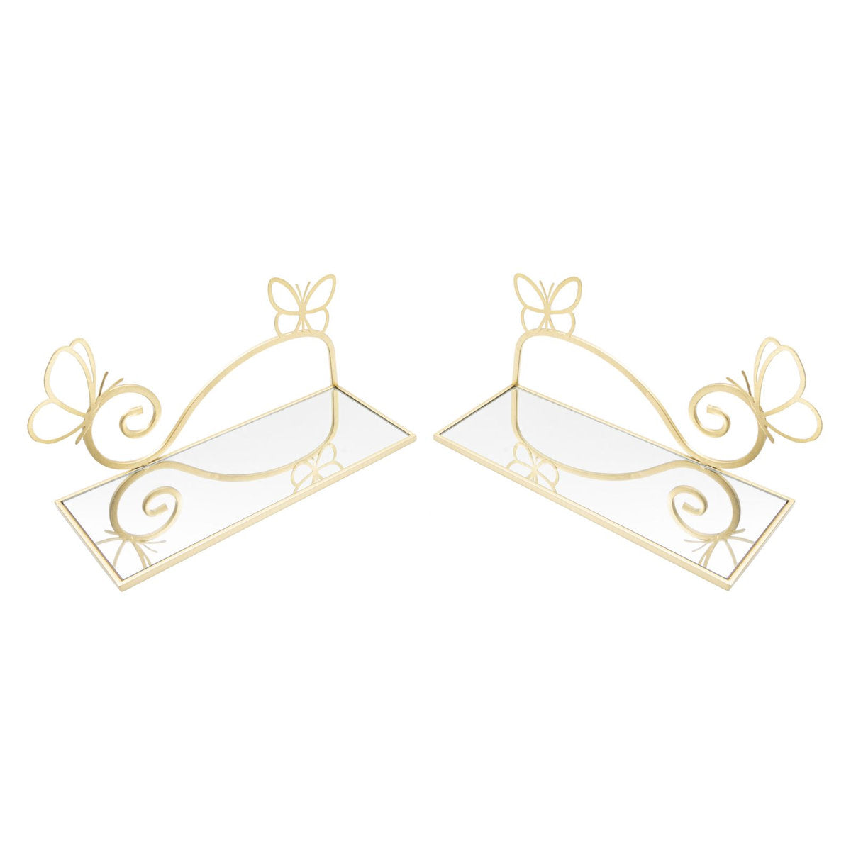 Pair of Golden Metal Wall Shelves with Mirrored Glass & Butterfly Decor