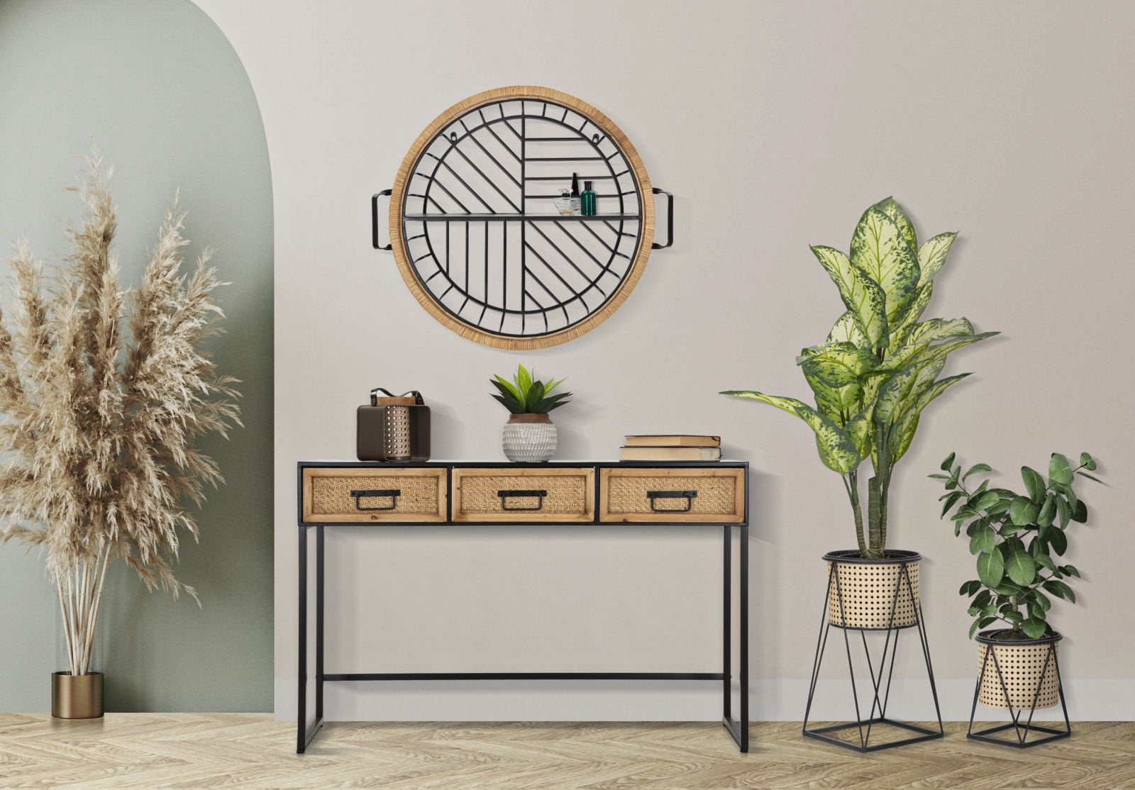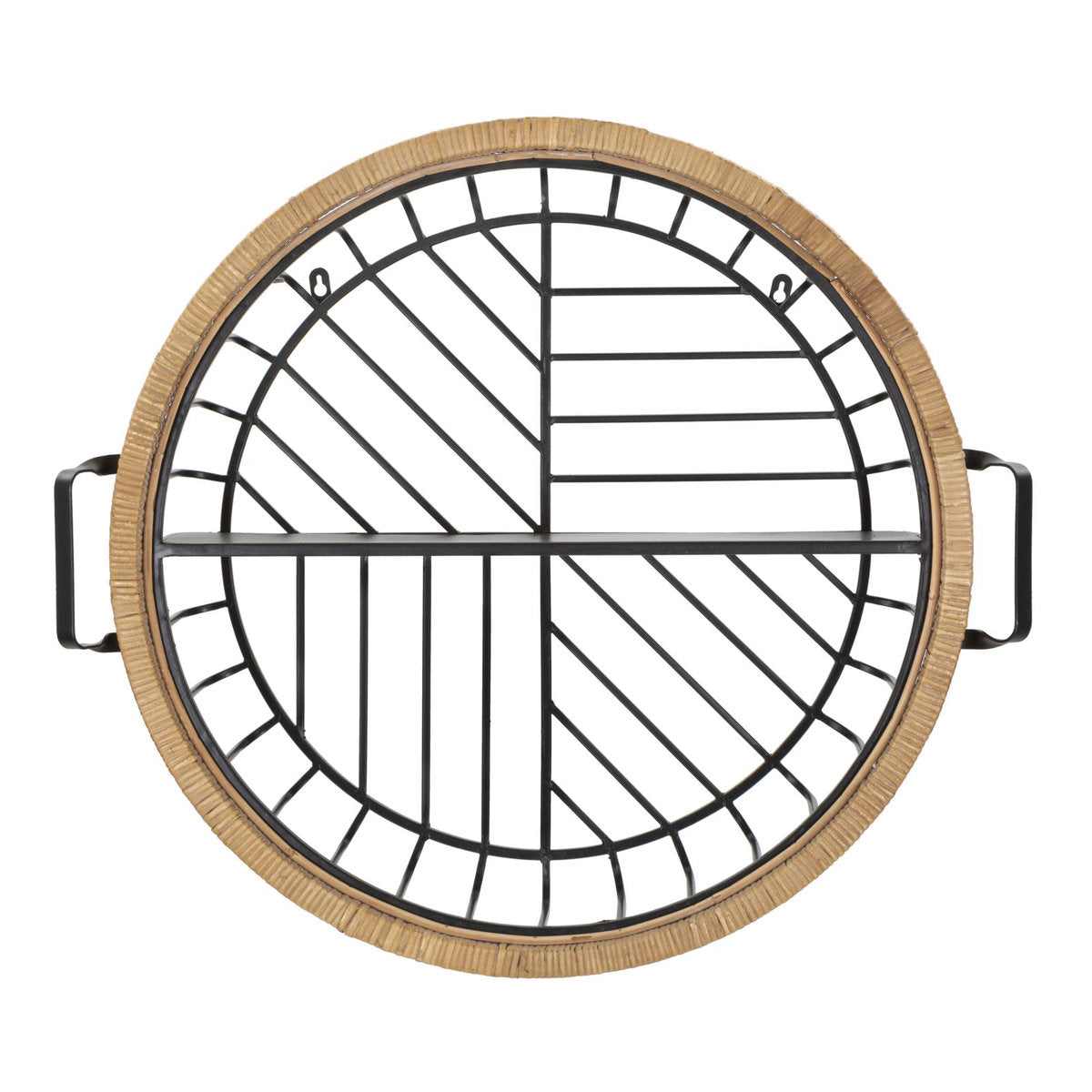 Mensola da parete in metallo nero con struttura in rattan intrecciato – Design a cestino