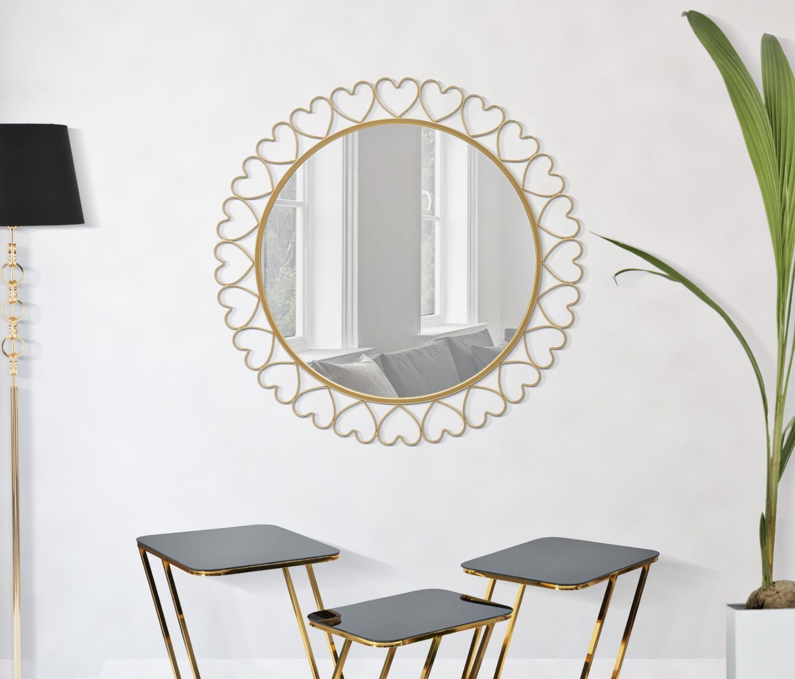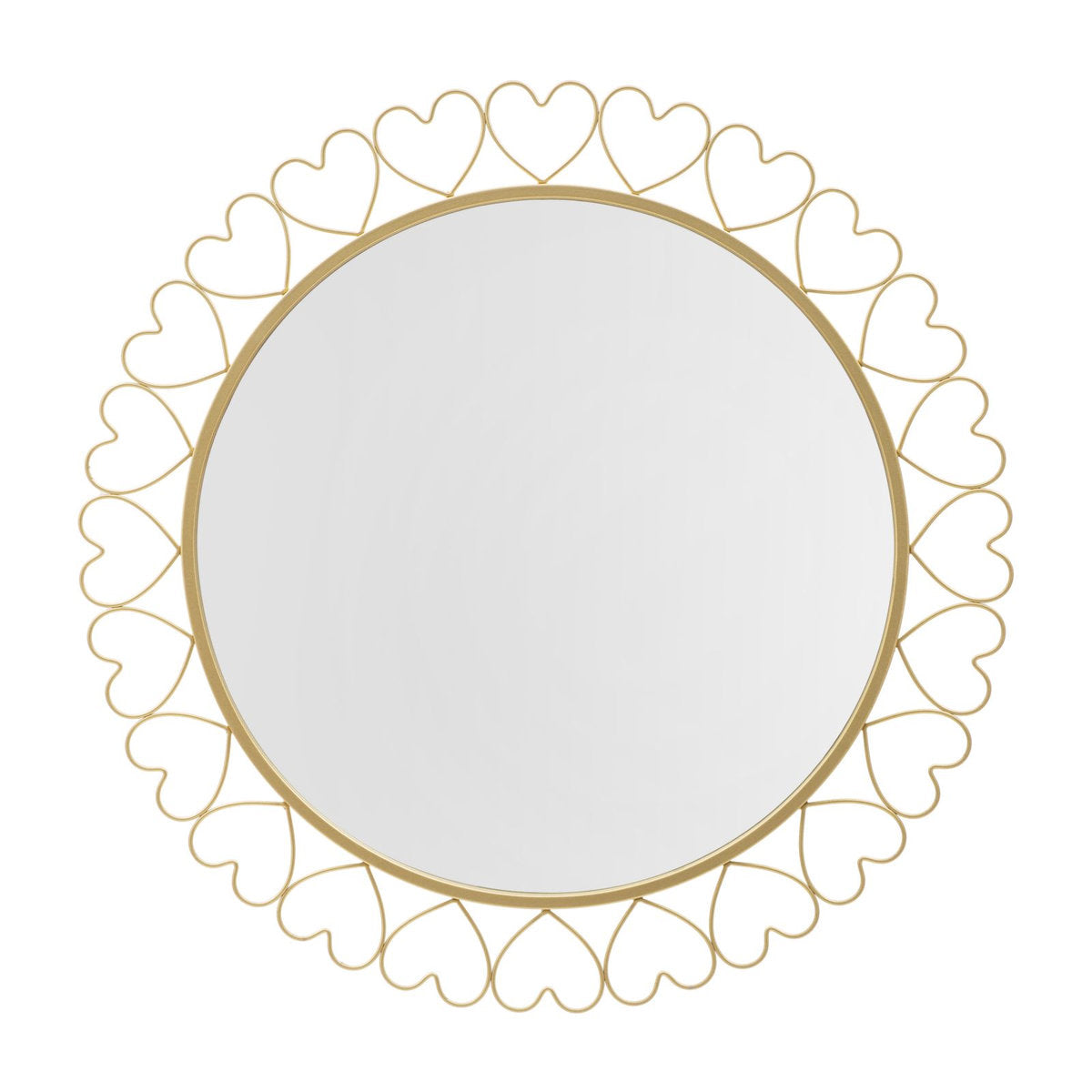 Specchio rotondo in metallo dorato con cornice a forma di cuore tenero