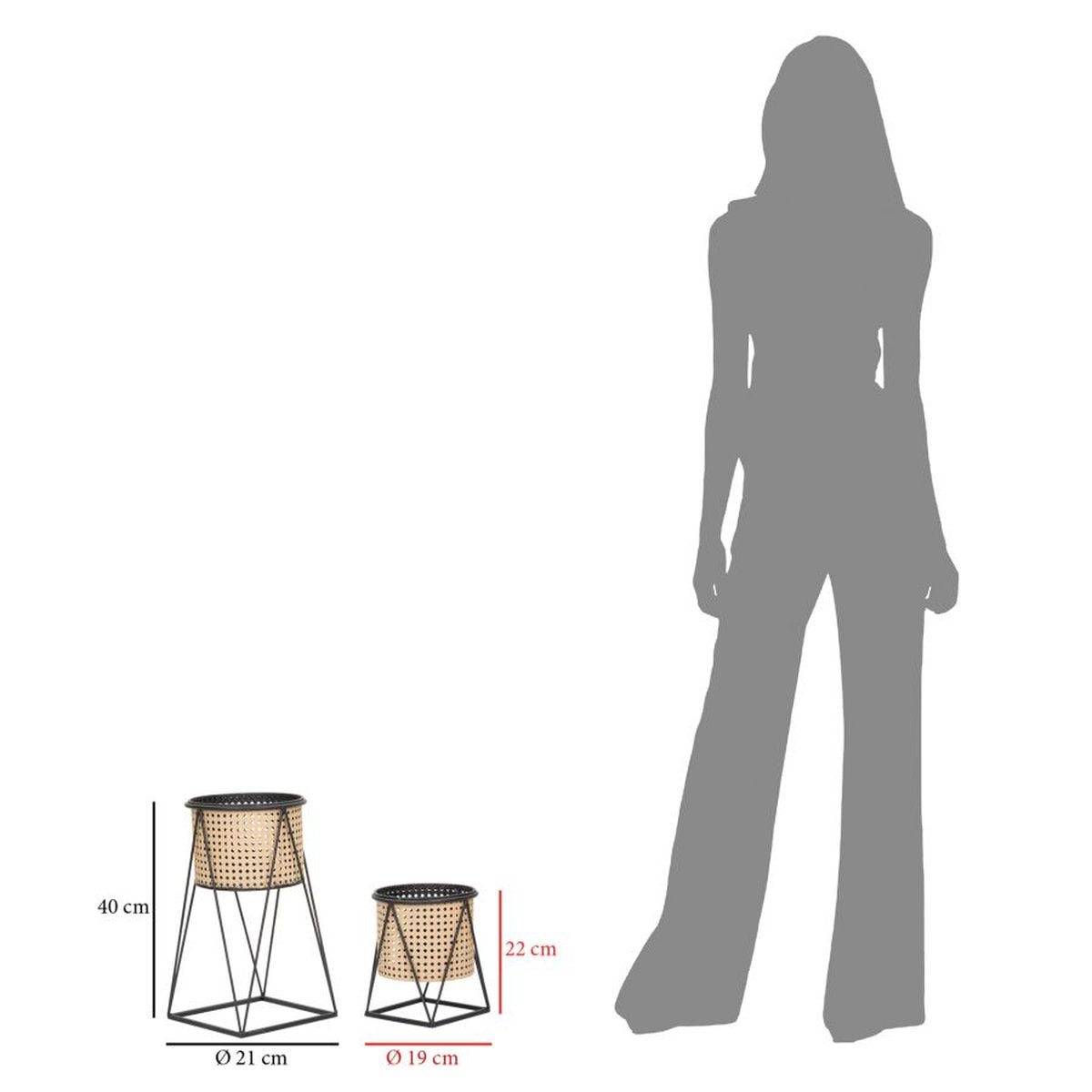 Set van twee crèmekleurige metalen vaashouders met Weense rietjesdetails en voetstuk.