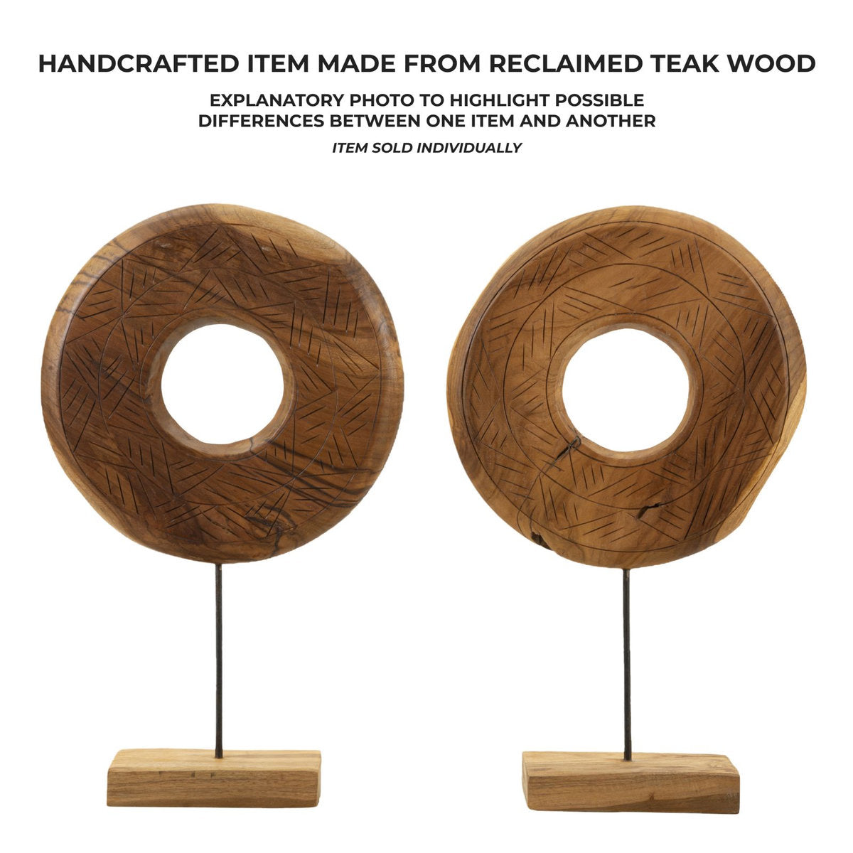 Round Teak Sculpture with Inlaid Irregular Motifs