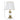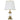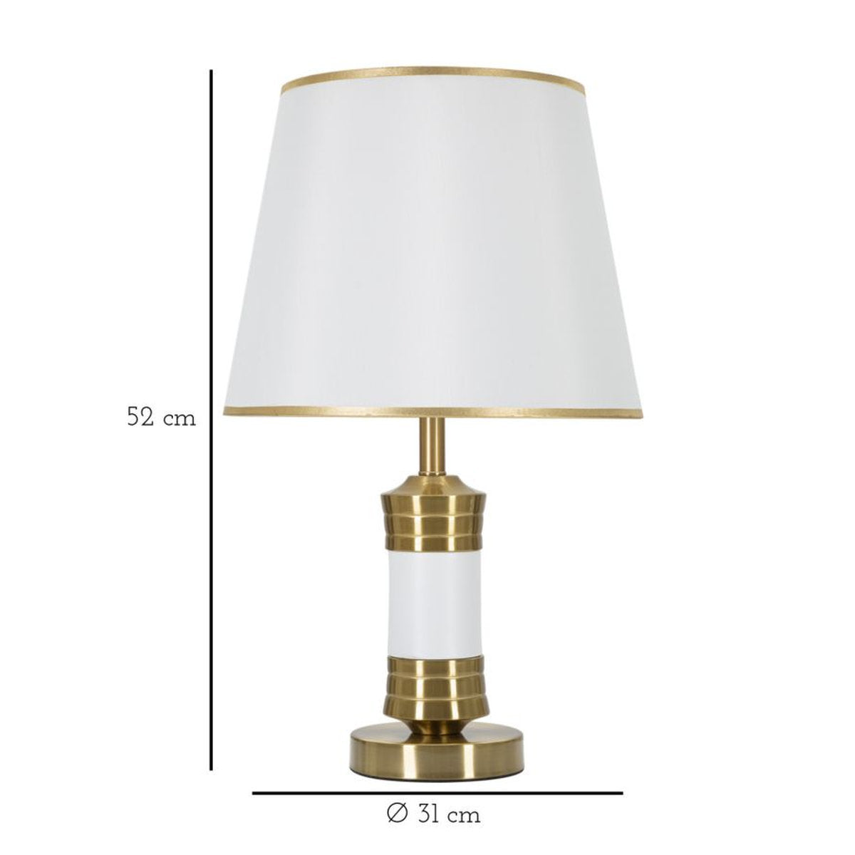 Gouden metalen tafellamp met ronde voet en witte kap.