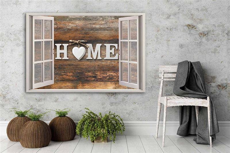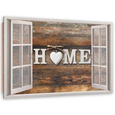 Deco panel print, Home inscription on a dark wood in a window
