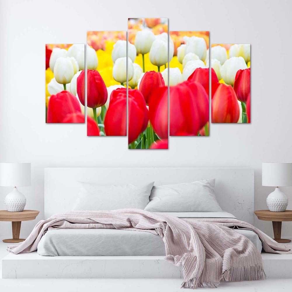 Five piece picture canvas print, White and red tulips