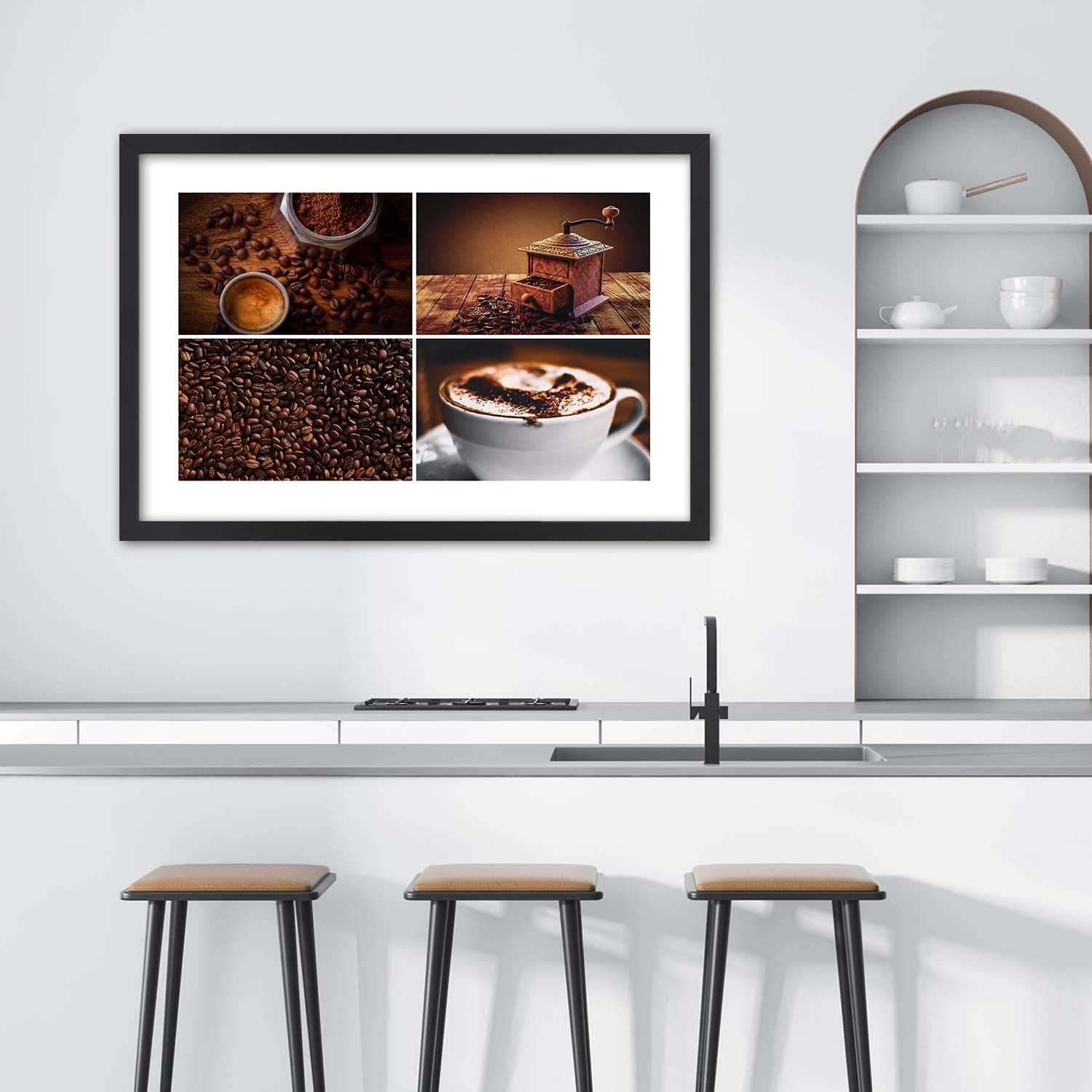 Picture in black frame, Coffee beans grinder and coffee